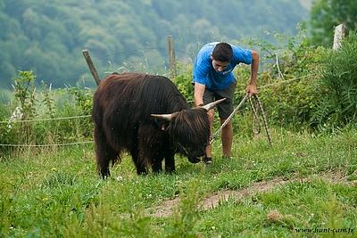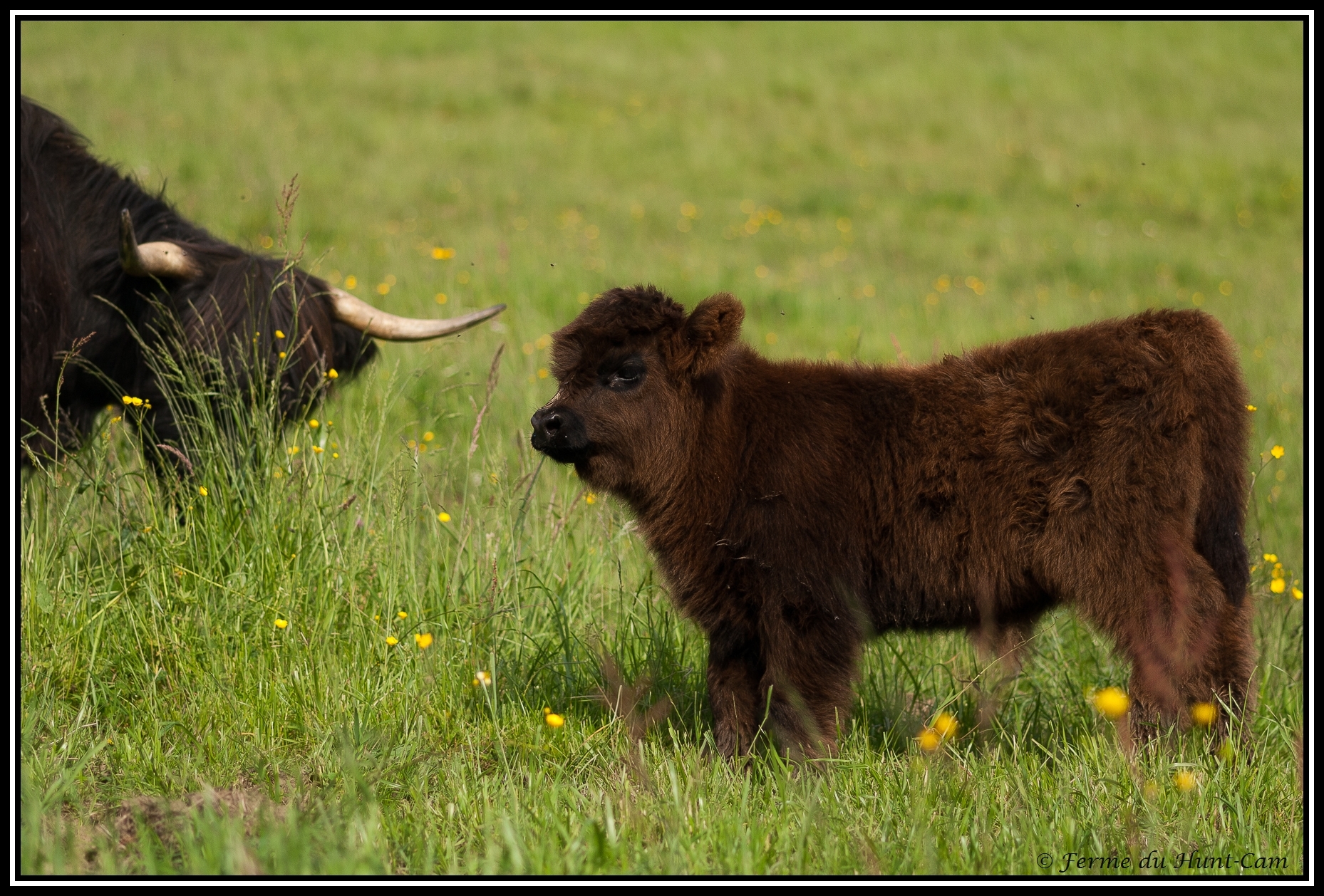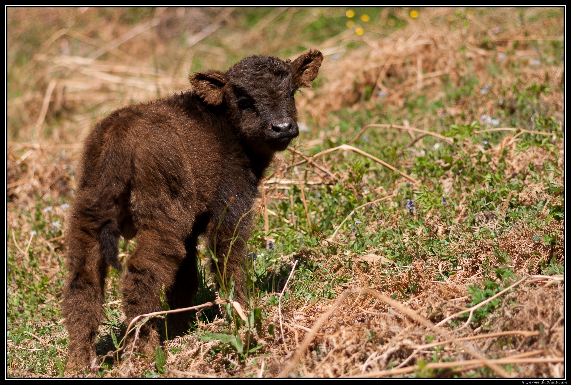 Bon en arrivant dans le pré il était essoufflé (normal après cette grimpette), mais ça ne l'a pas empêché en voyant les vaches de pousser son beuglement de mâle ! Même s'il a encore une petite voix |