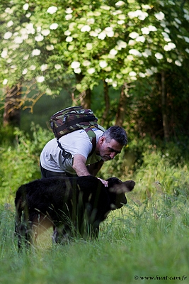 Et je le retrouve ! Il a dévissé dans la pente et il est cul par dessus tête coincé dans des branchages. Vite vite j'y vais comme je peux (car il y a vraiment beaucoup de pente), je me raccroche aux herbes hautes pour avancer et ne pas décrocher. Je le prend et le remet sur pattes.