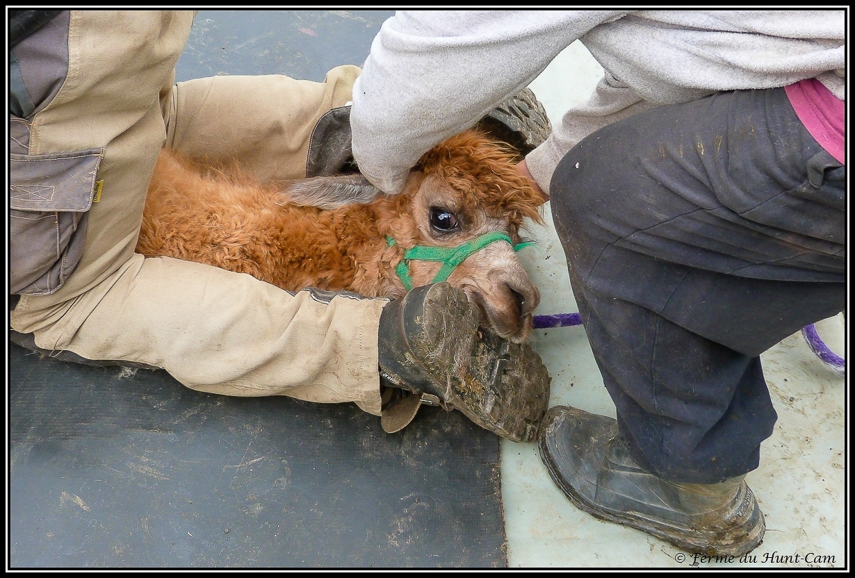 | Elle résite ! C'est important que ce soit une personne qui fasse cette extension et non un treuil. Ainsi, si l'animal se débat il peut lâcher un peu alors qu'avec un treuil fixe, il y a des risques que l'alpaga se démette une épaule. |