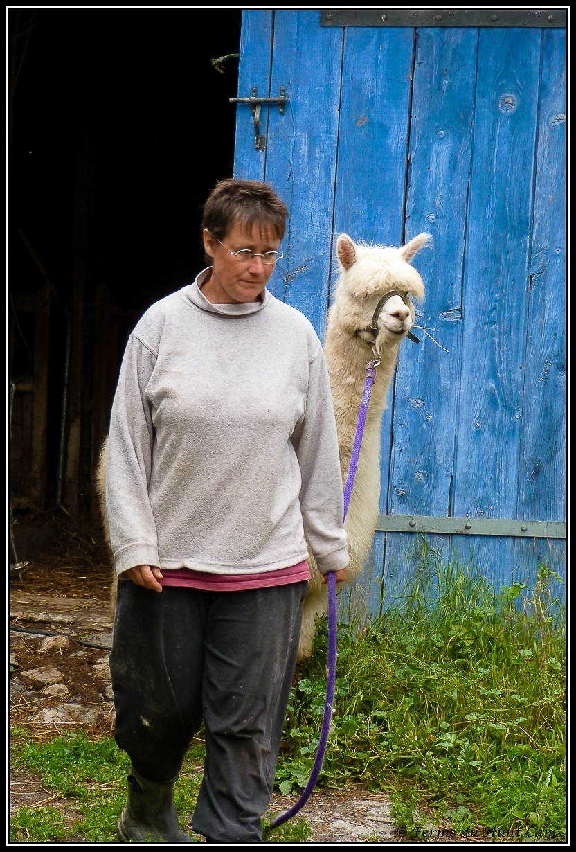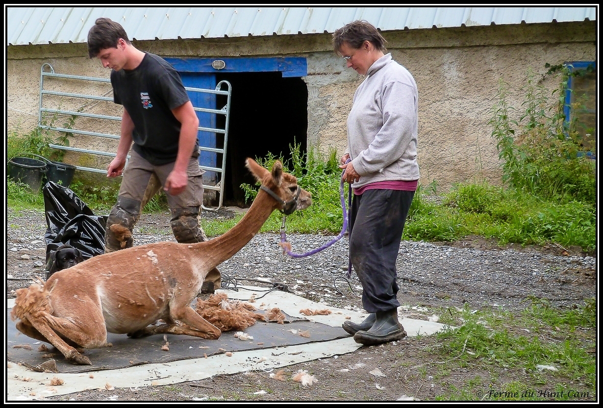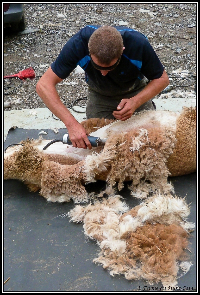 Une fois par an, nous faisons tondre les alpagas, juste avant l'été et les grosses chaleurs. Nous passons par un tondeur professionnel. Quelqu'un qui sait manier calmement les alpagas et les tondre sans créer trop de stress.