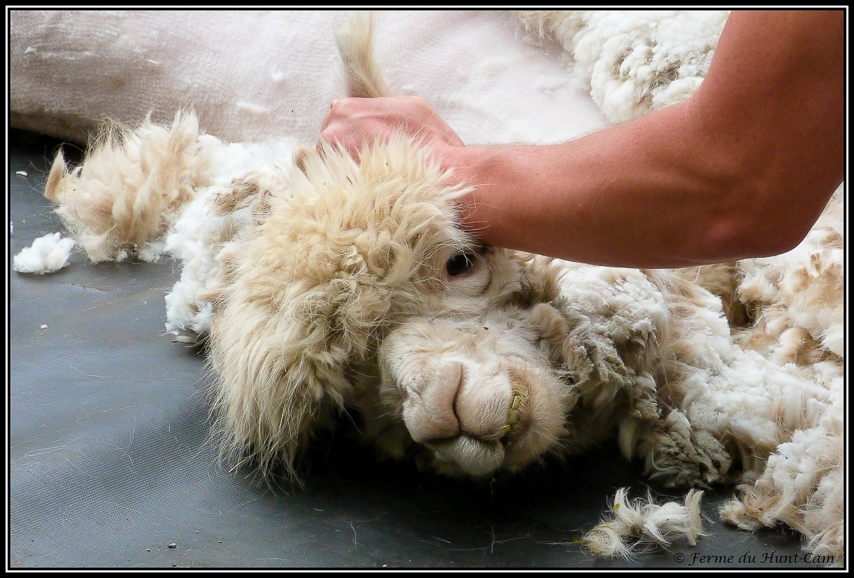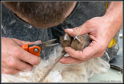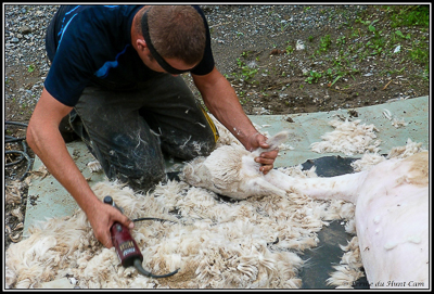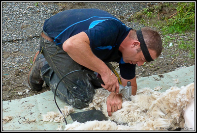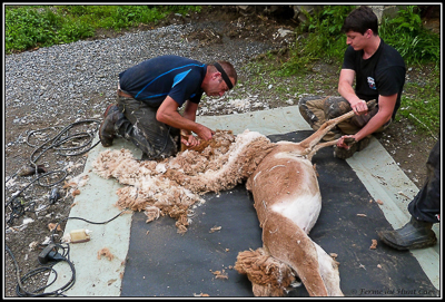 Pour ne pas salir les toisons au fil des tontes, il tond toujours du plus clair au plus foncé. Ainsi pas de risque de trouver des poils marron dans les toisons blanche. |