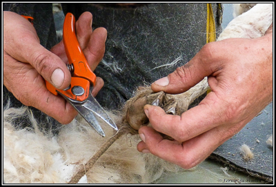 Une fois la tonte terminée, c'est la taille des onglons. Dulka mange tous les bouts d'ongles qui traînent. |